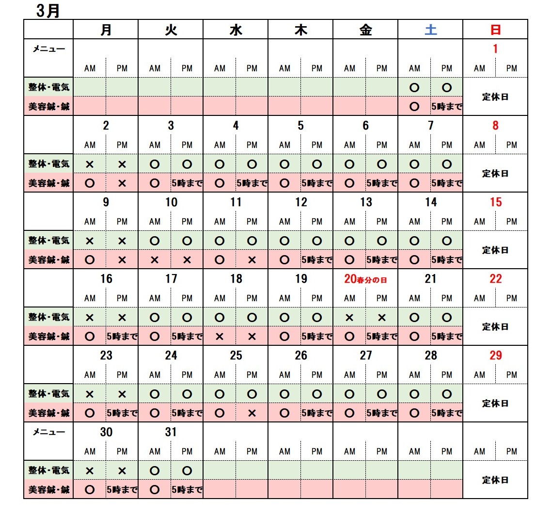 3月の営業日のお知らせをいたします。